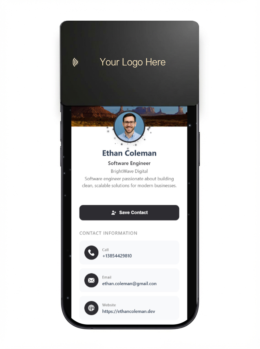 Your digital profile is fully editable at any time using a secure username and PIN, allowing you to update your information, photos, and colors as your brand evolves. You can share your card by tap or by sending your personal link through messaging apps or social platforms.
